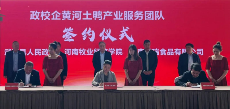 武陟縣政府副縣長(zhǎng)蘇瑞君、河南牧業(yè)經(jīng)濟(jì)學(xué)院副校長(zhǎng)楊國(guó)宇、河南旭瑞食品有限公司副總經(jīng)理邱國(guó)平為政校企三方共建“黃河土鴨”產(chǎn)業(yè)服務(wù)團(tuán)隊(duì)簽約。三方將共同構(gòu)建“政府+產(chǎn)業(yè)服務(wù)團(tuán)隊(duì)+龍頭企業(yè)”服務(wù)合作模式,推動(dòng)產(chǎn)科教融合發(fā)展。同時(shí),河南牧業(yè)經(jīng)濟(jì)學(xué)院將授予我們“百名專家助百村(企)工程服務(wù)基地”和“博士工作站”兩塊響亮的牌子,由12名專業(yè)博士為集團(tuán)提供的技術(shù)創(chuàng)新支持。